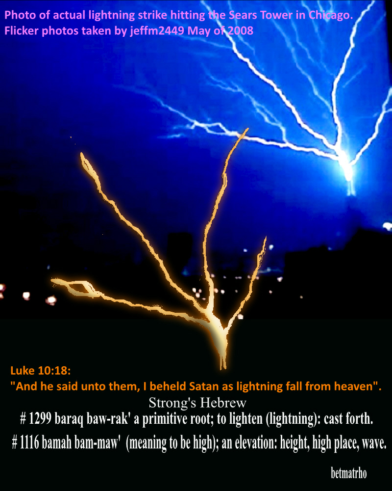 LUKE 10:18 "And he said unto them, I beheld Satan as lightning fall from the [heights] of heaven." The hidden meaning see Strong's Hebrew Concordance: