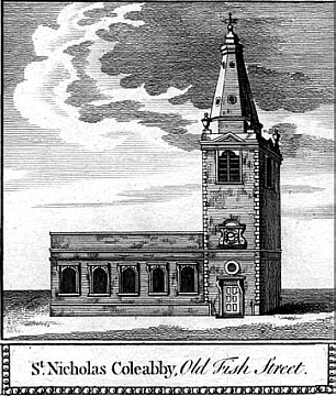The History of St. Nicholas Cole Abbey, where Thomas & Mark Sension were baptized - sons of Matthias & Mary Sension. In the year 1666 the old church was destroyed in the Great London Fire, but was rebuilt 1671-1681. "The name Cole Abbey is generally thought to be a